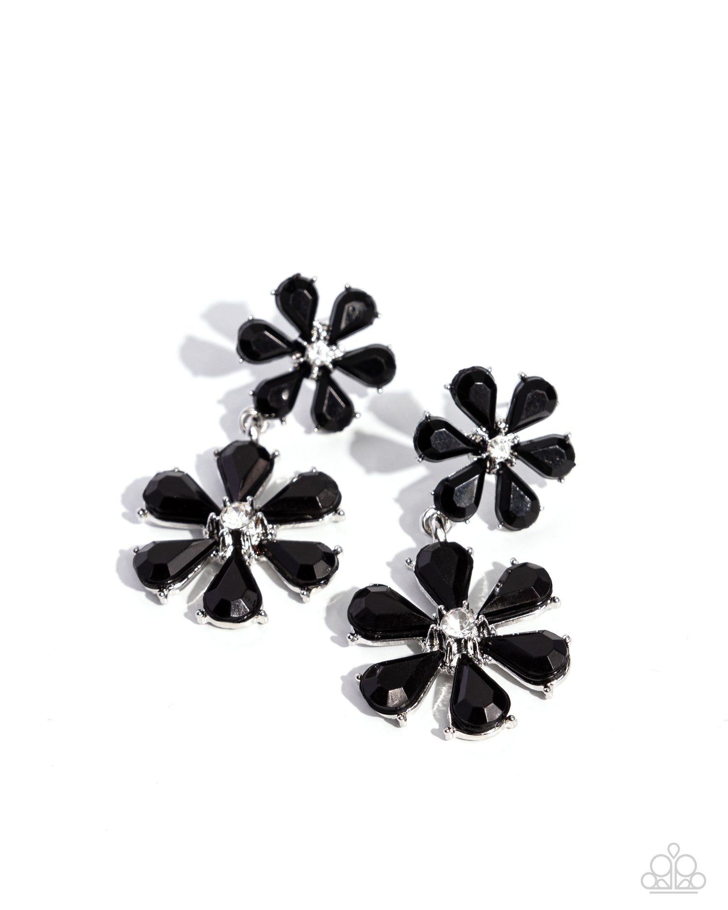 Dotted with dainty white rhinestone centers, a faceted assortment of black teardrop beaded flowers link below the ear, gradually increasing in size for a playful pop of color. Earring attaches to a standard post fitting.