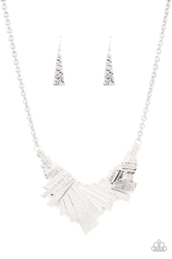 Varying in hammered detail, a collision of rectangular silver frames connect into three shockingly shimmery plates below the collar for an intense industrial inspired look. Features an adjustable clasp closure.