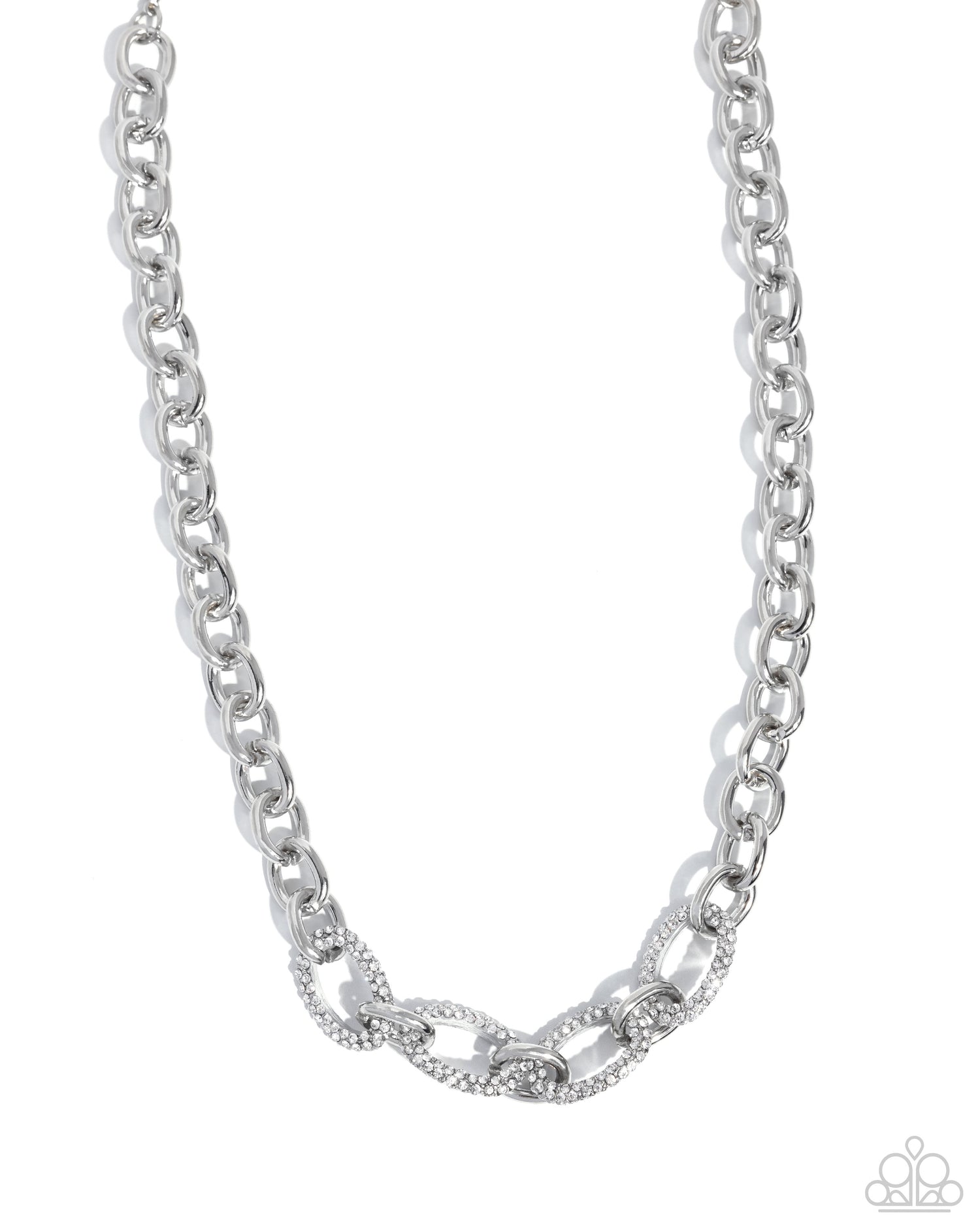 A chunky silver chain features oversized links, with a quartet of links encrusted in white rhinestones for a sparkling finish. The bold design adds a luxurious and elegant touch to any look. Features an adjustable clasp closure.