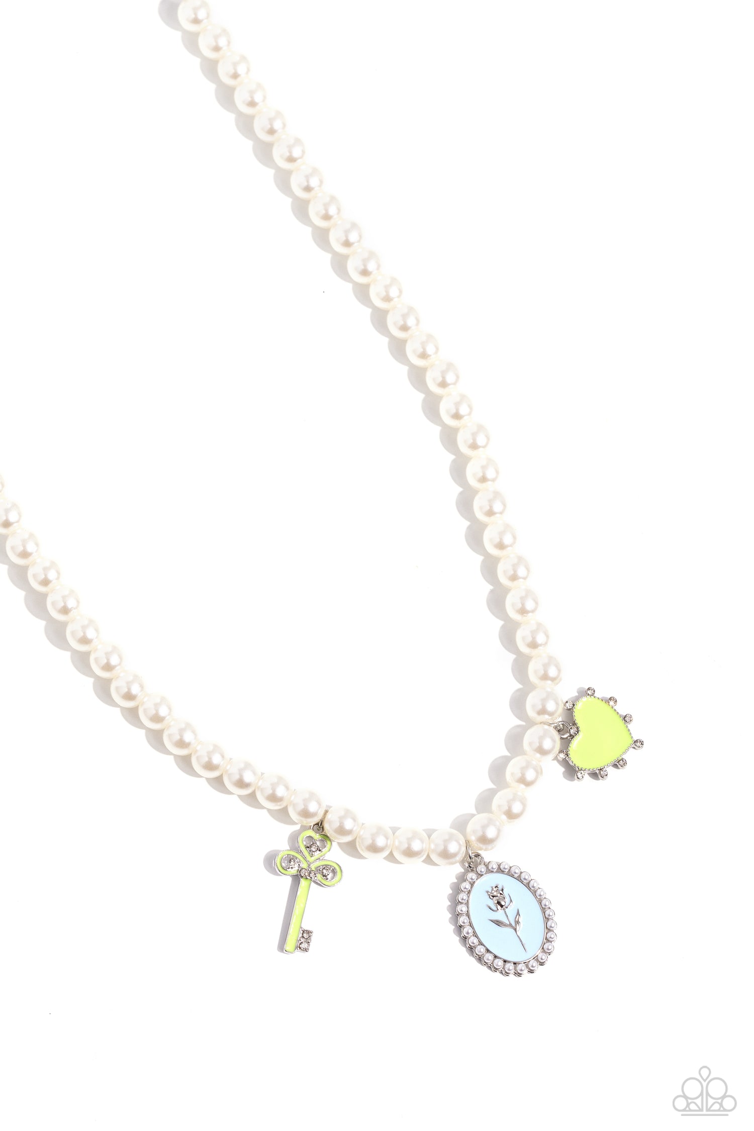 Infused along an invisible string, a collection of gleaming white pearls coalesces below the collar for a refined display. Featuring white rhinestones and dainty pearl accents, three Kohlrabi and blue painted charms, including a key, rose pendant, and studded heart, dangle below the pearly display for a girly pop of color. Features an adjustable clasp closure.