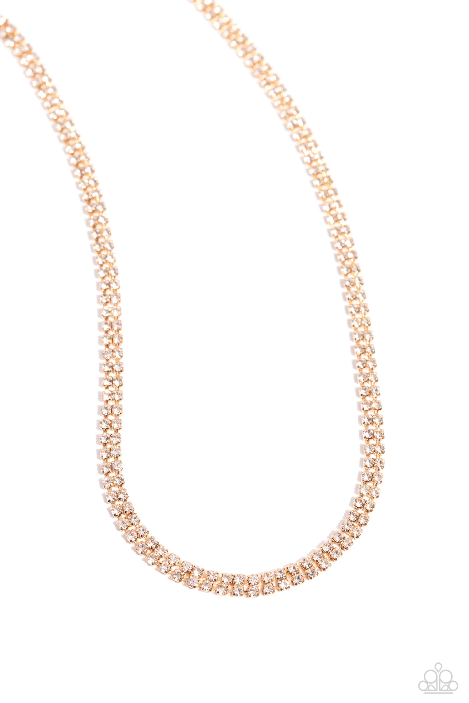 Featuring classic gold square fittings, two dainty rows of white rhinestones glisten down the neckline for a sparkling display. Features an adjustable clasp closure.