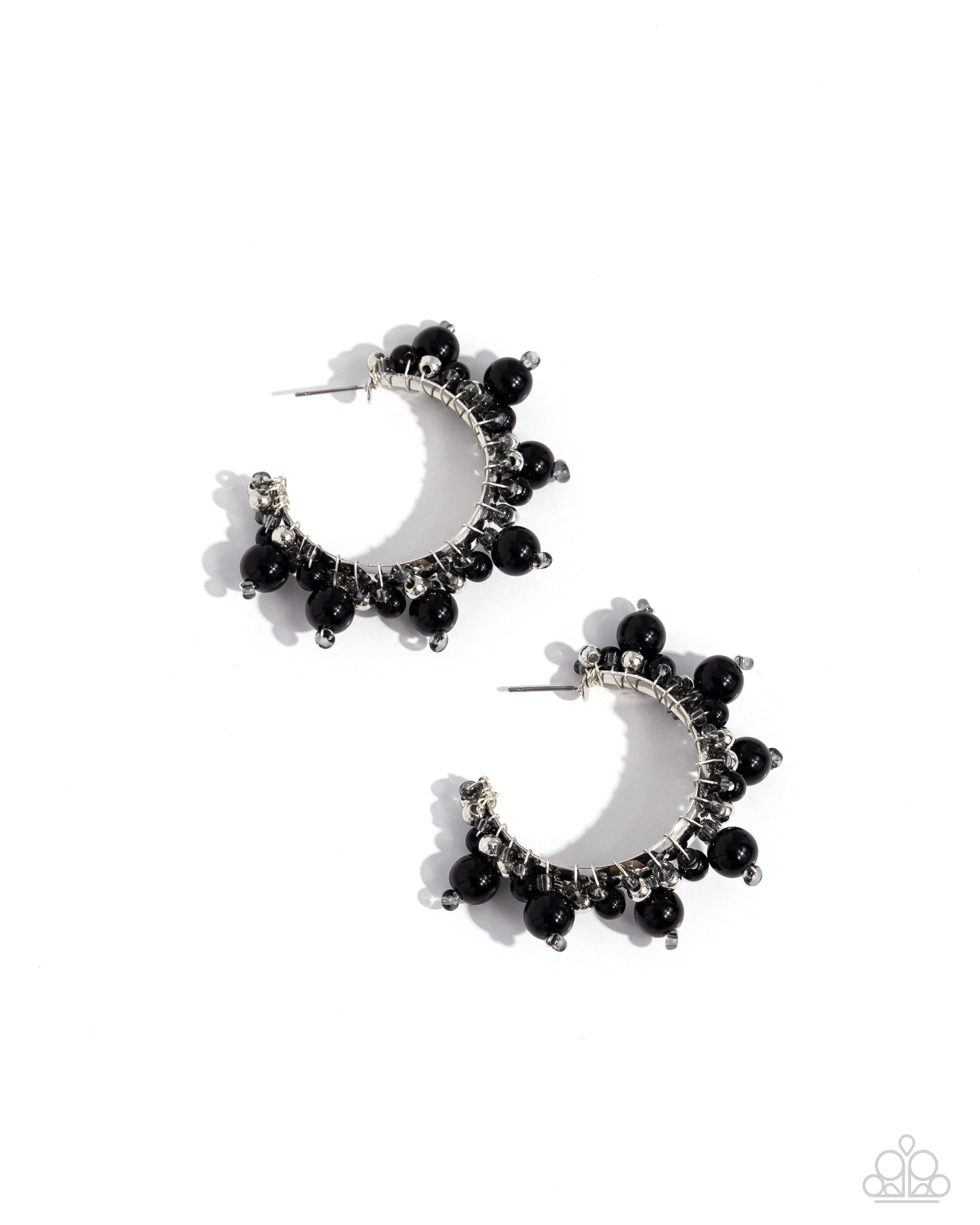 Threaded along a dainty silver wire, smoky black seed beads, silver beads, and black pearls explode and wrap across the front of a classic silver hoop for an unexpected pop of shimmer. Hoop measures approximately 1 1/4" in diameter.