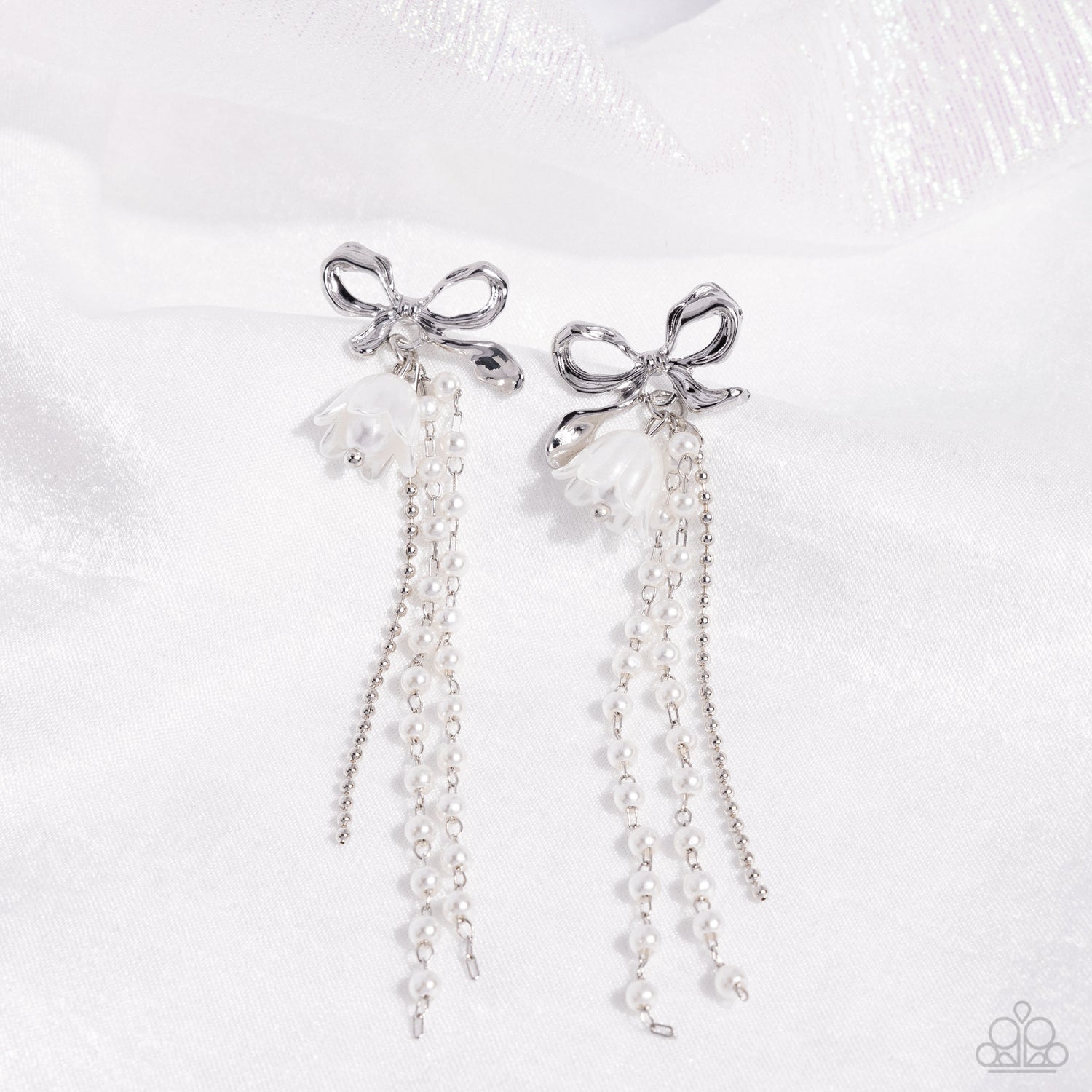 A high-sheen silver bow gives way to a collection of dainty white pearls, a strand of silver ball chain, and a pearlized tulip for an enchanting, elegant array. Earring attaches to a standard post fitting.