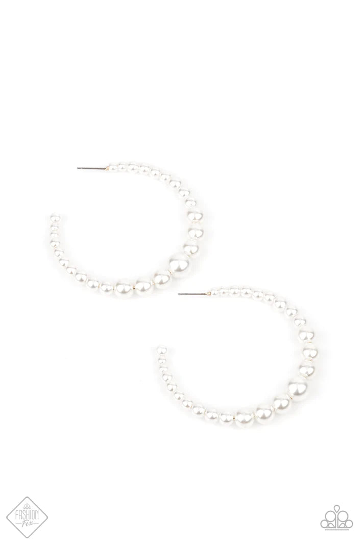 Gradually increasing in size at the center, a classy row of white pearls are threaded along an oversized hoop for a posh finish. Earring attaches to a standard post fitting. Hoop measures approximately 2 1/4" in diameter.