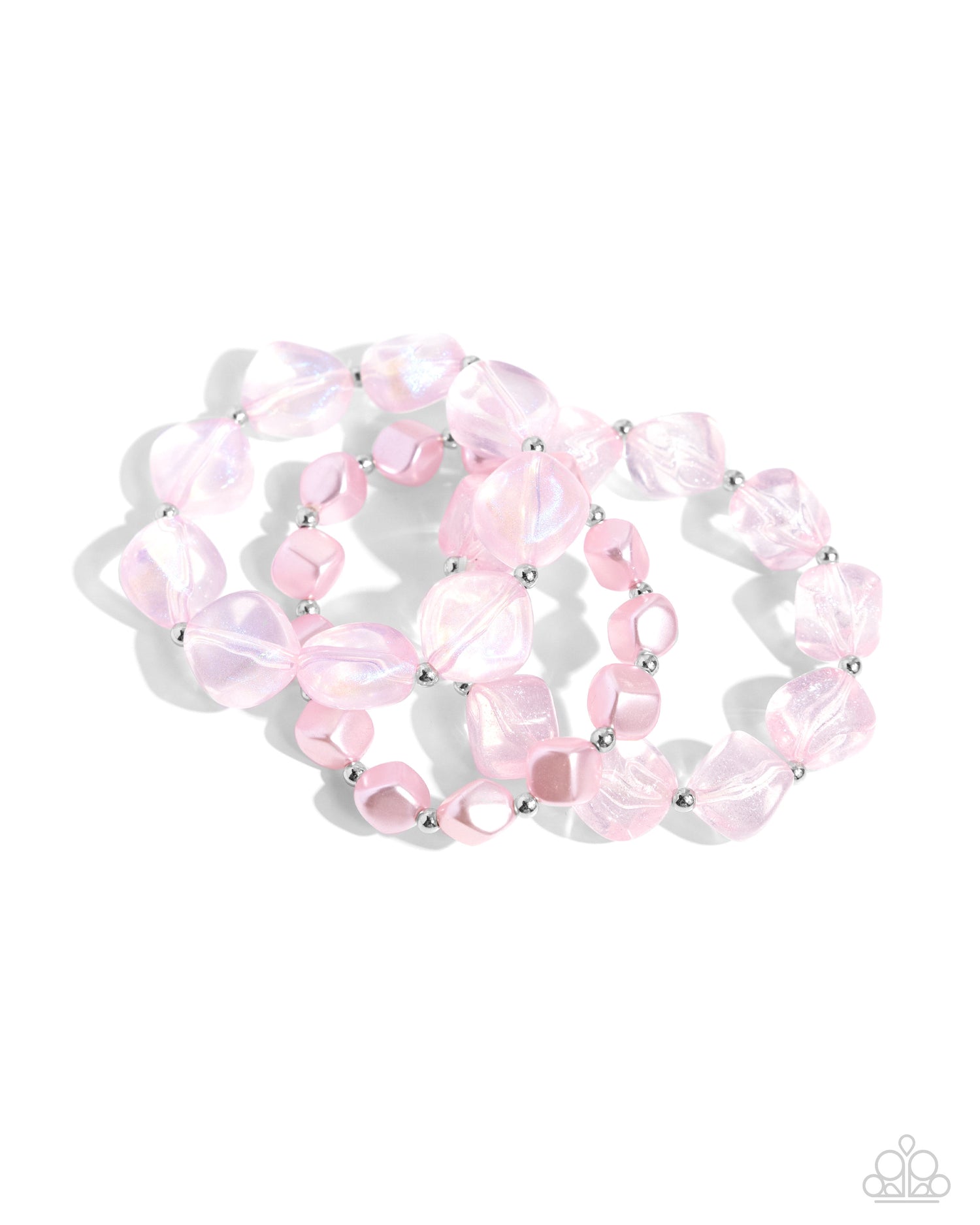 Cubed baby pink pearls join a strand of baby pink acrylics and glittery acrylics that alternate with silver beads along elastic stretchy bands around the wrist for a sweet stack.