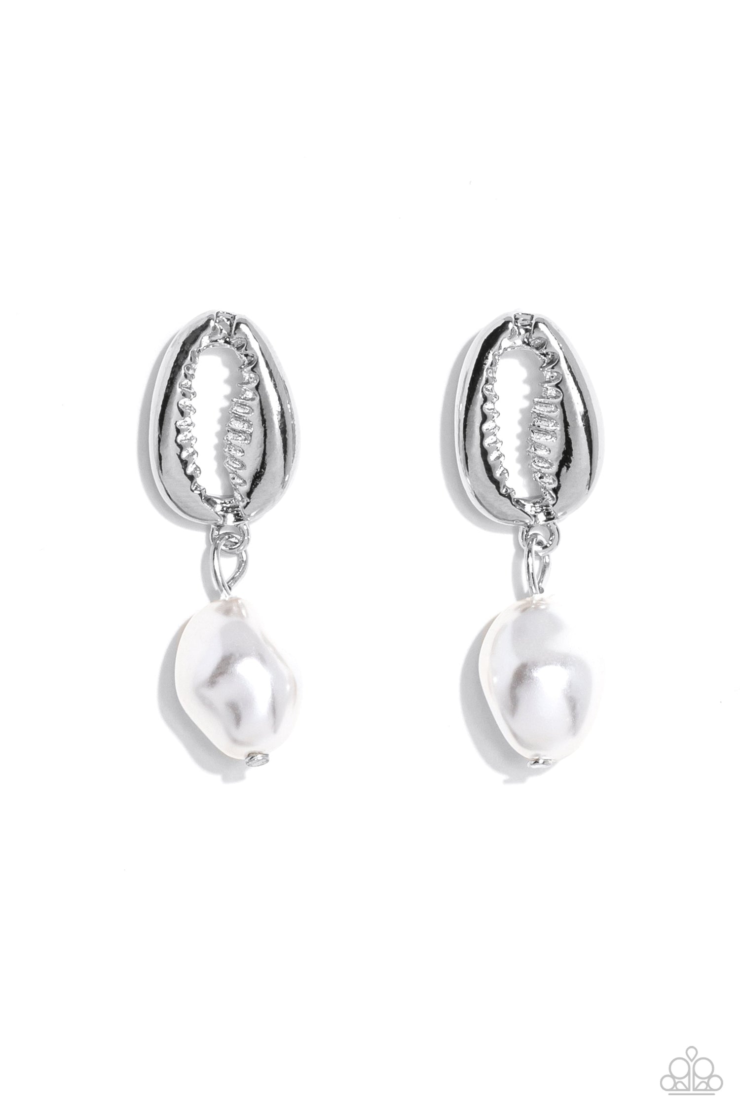 Dripping from a high-sheen silver cowrie shell, a baroque white pearl gleams past the ear for a simple beachy statement. Earring attaches to a standard post fitting.