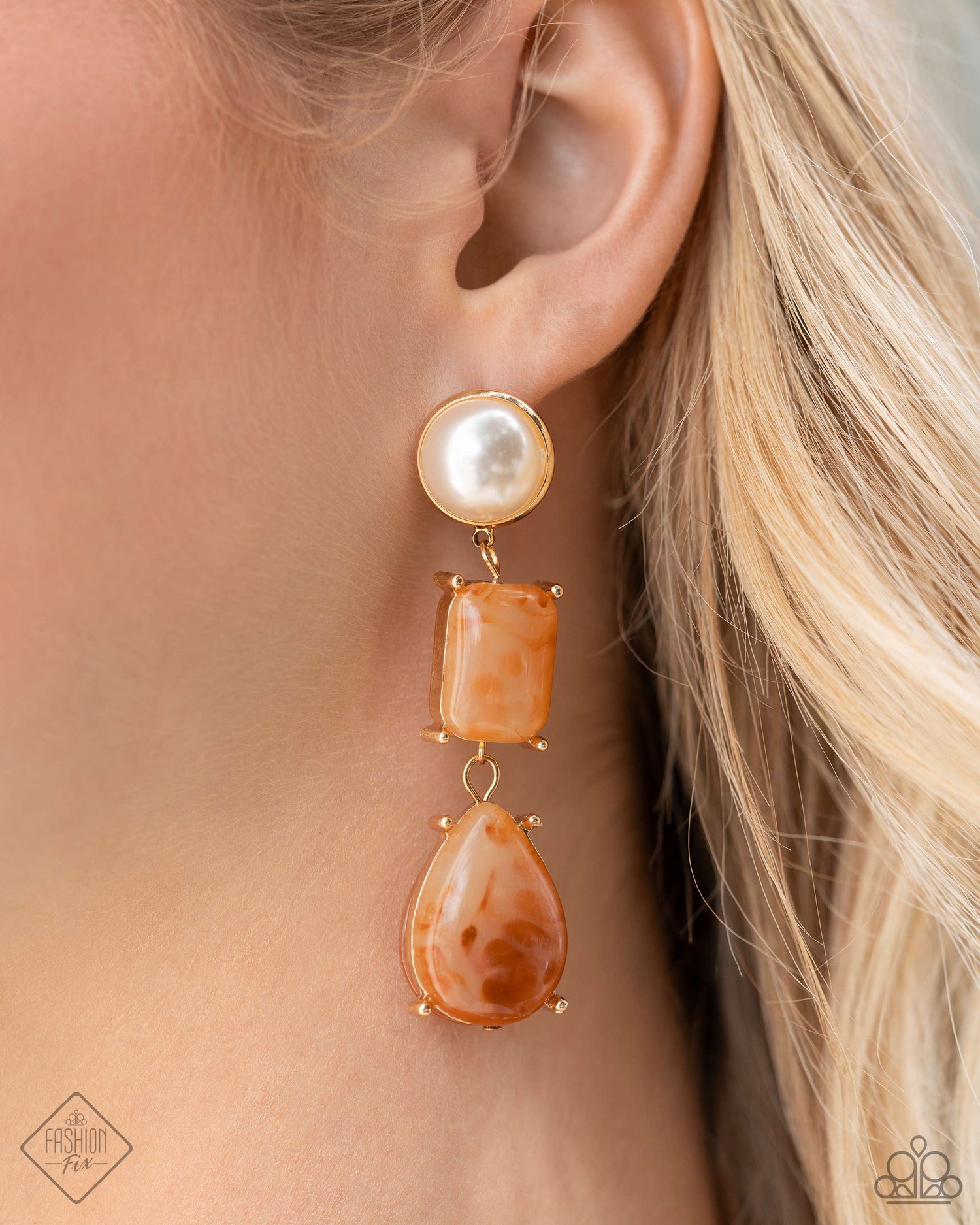 Encased in a gold fitting, a glossy white pearl gives way to a collection of orange-marbled beads for a sophisticated shimmer. Featuring teardrop and emerald style cuts, each orange-marbled bead is delicately encased in gold-pronged frames, further adding a touch of color to the glamorous look. Earring attaches to a standard post fitting.