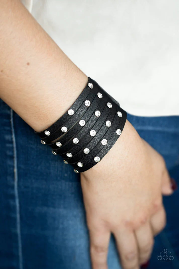 A thick black leather band has been spliced into numerous black strands. Featuring sleek silver frames, glittery white rhinestones are sprinkled across the leather bands for a sassy finish. Features an adjustable snap closure.