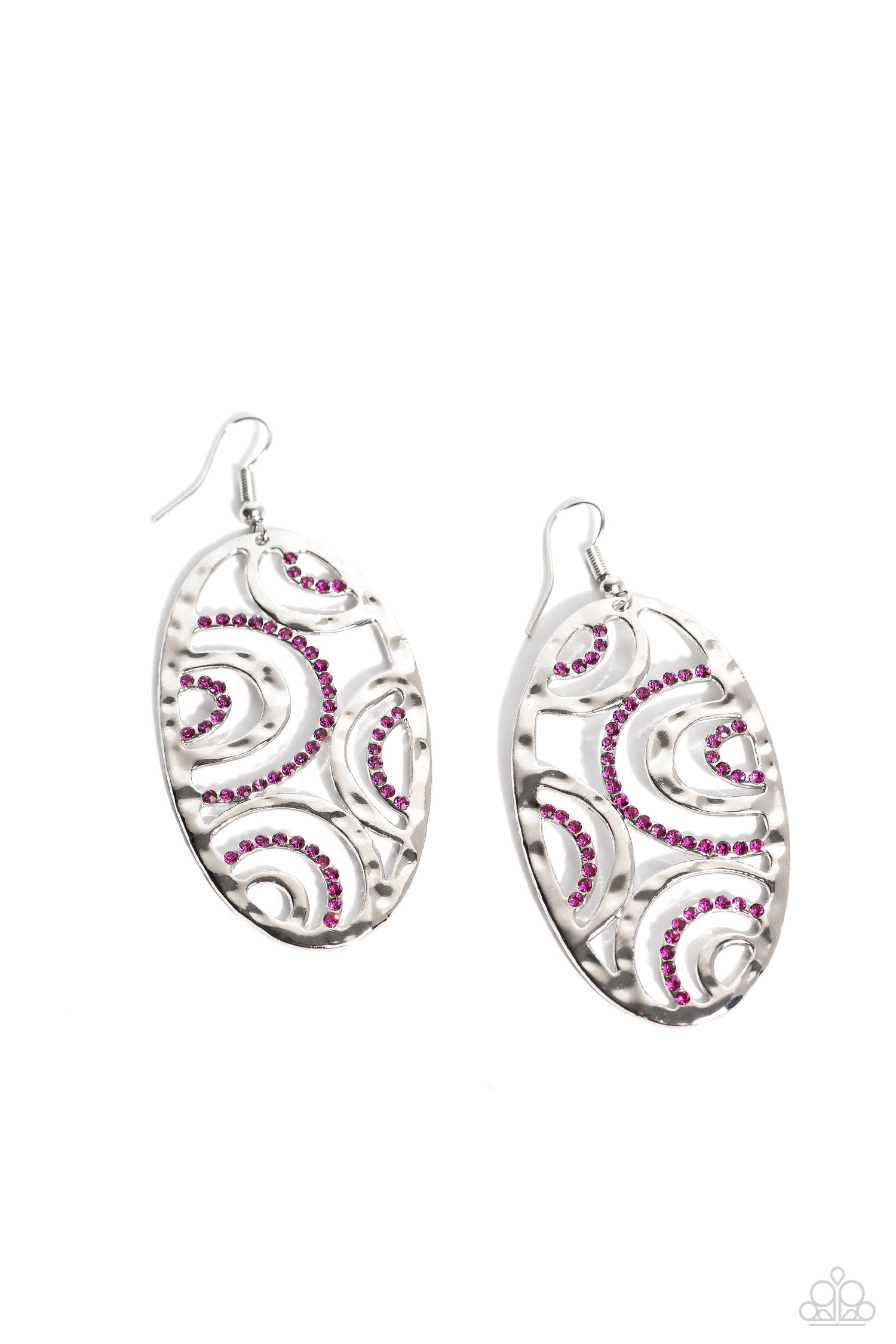 Hammered silver bars and ribbons of dazzling pink rhinestones curve and ripple into an abstract circular design, creating a dazing dazzle. Earring attaches to a standard fishhook fitting.