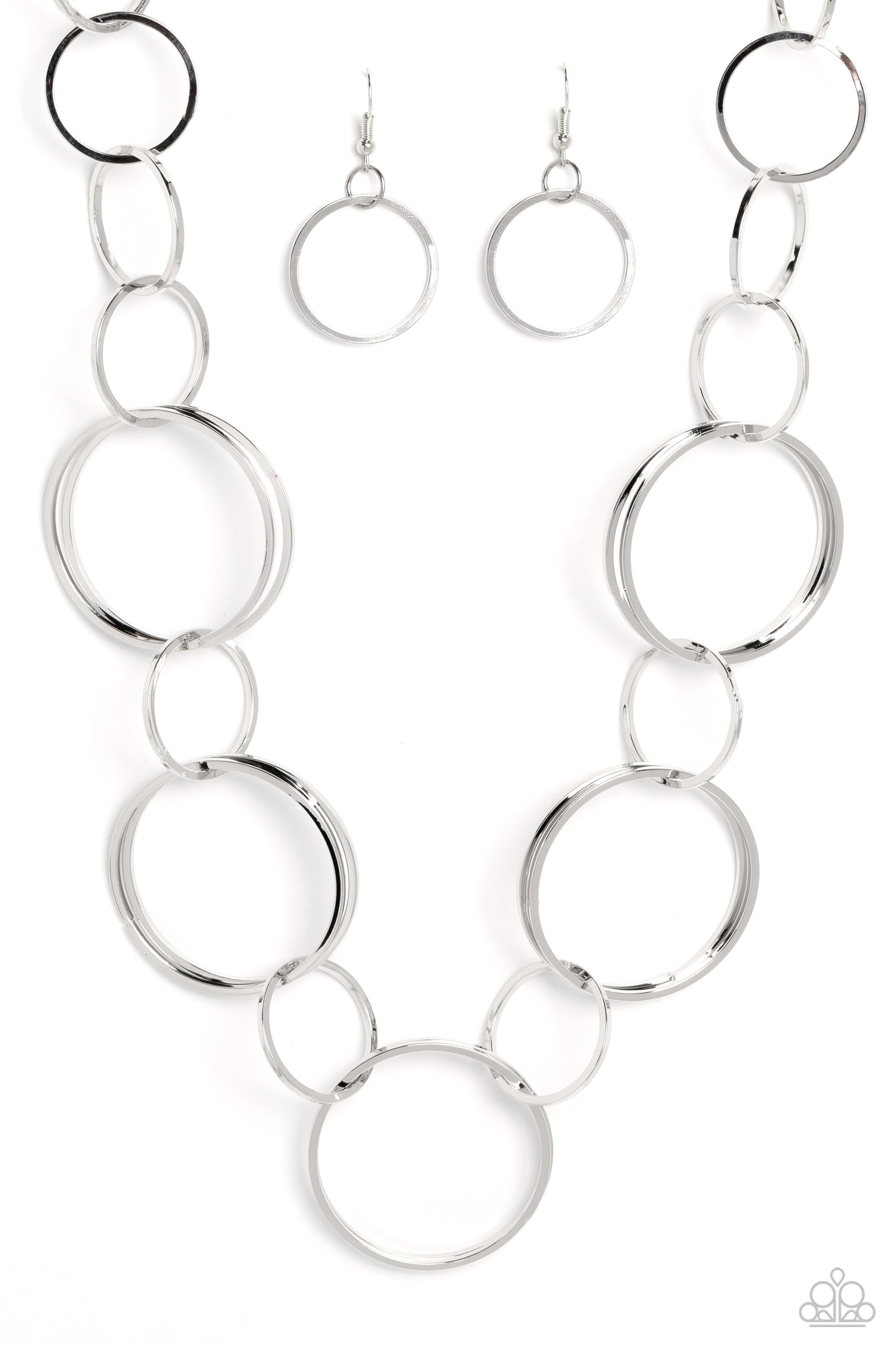 A shimmering collection of thin silver hoops in varying sizes interlock and coalesce down the neckline for a refined monochromatic statement piece. Features an adjustable clasp closure.