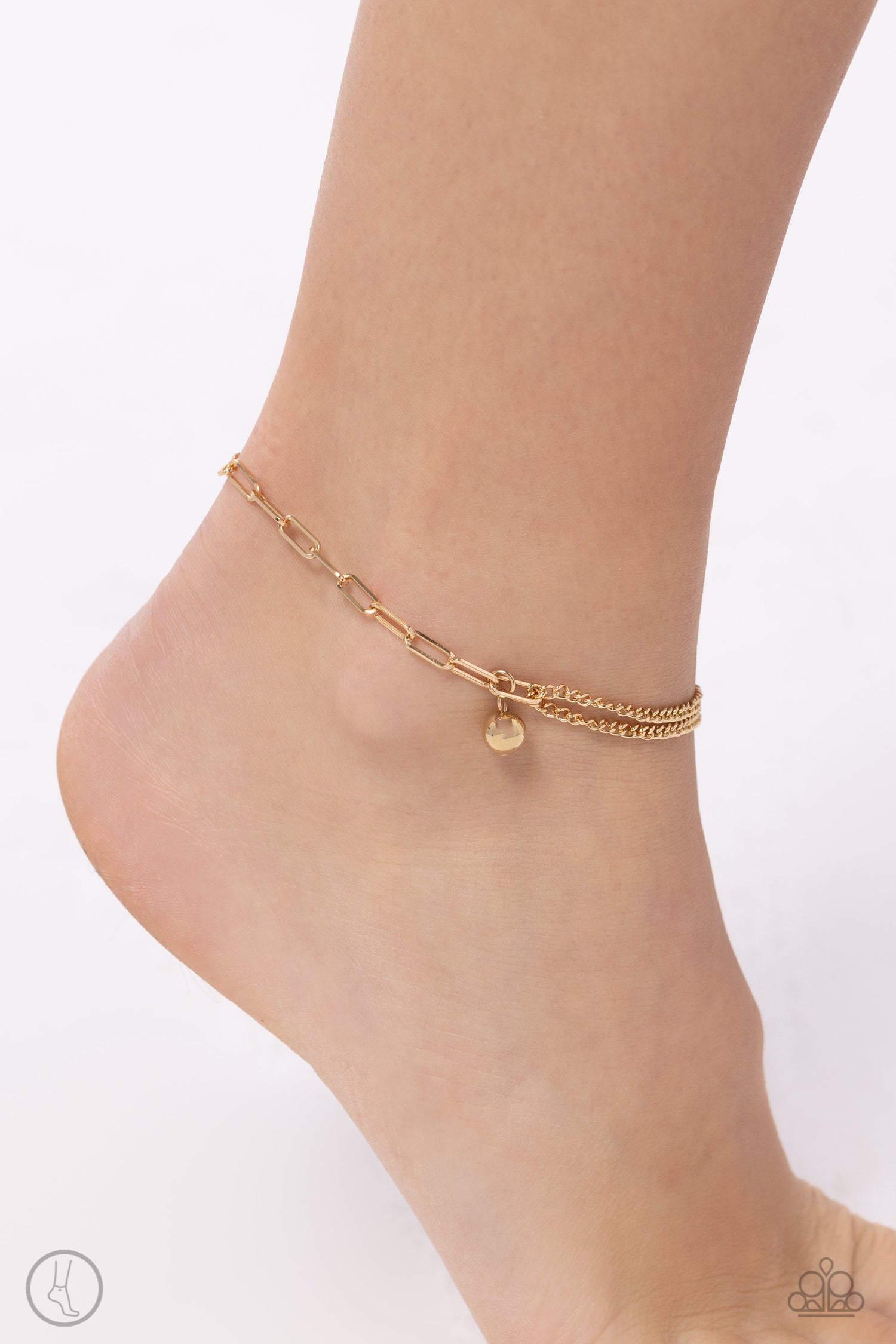 A strand of gold paperclip chain collides with layers of classic chains to create an abstract blend of grit and glitz. A solitaire gold bead cascades from the display, perfectly balancing the monochromatic design. Features an adjustable clasp closure.