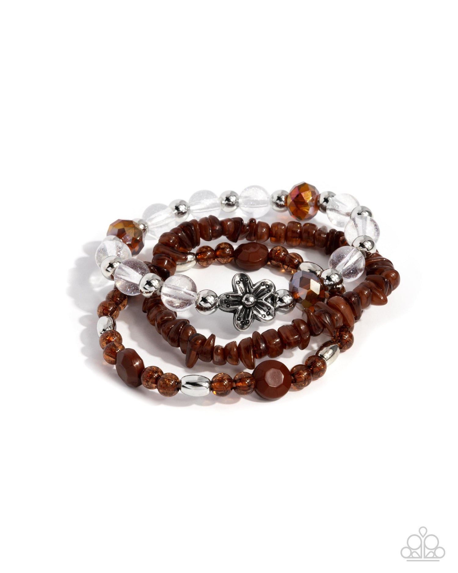 Infused along elastic stretchy bands, a collection of clear acrylics with silver glitter, silver beads, a silver floral bead, topaz beads in varying shapes and opacities, and faceted topaz beads stack along the wrist for a spellbinding pop of color.