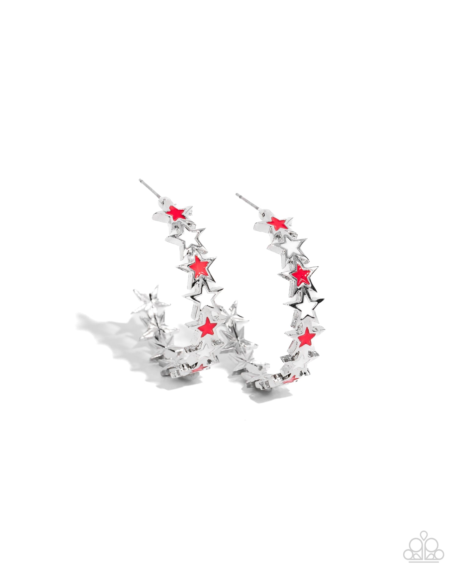 A charming collection of red and white-painted silver stars curl around the ear, resulting in a patriotic-inspired fashion. Earring attaches to a standard post fitting. Hoop measures approximately 1 1/2" in diameter.