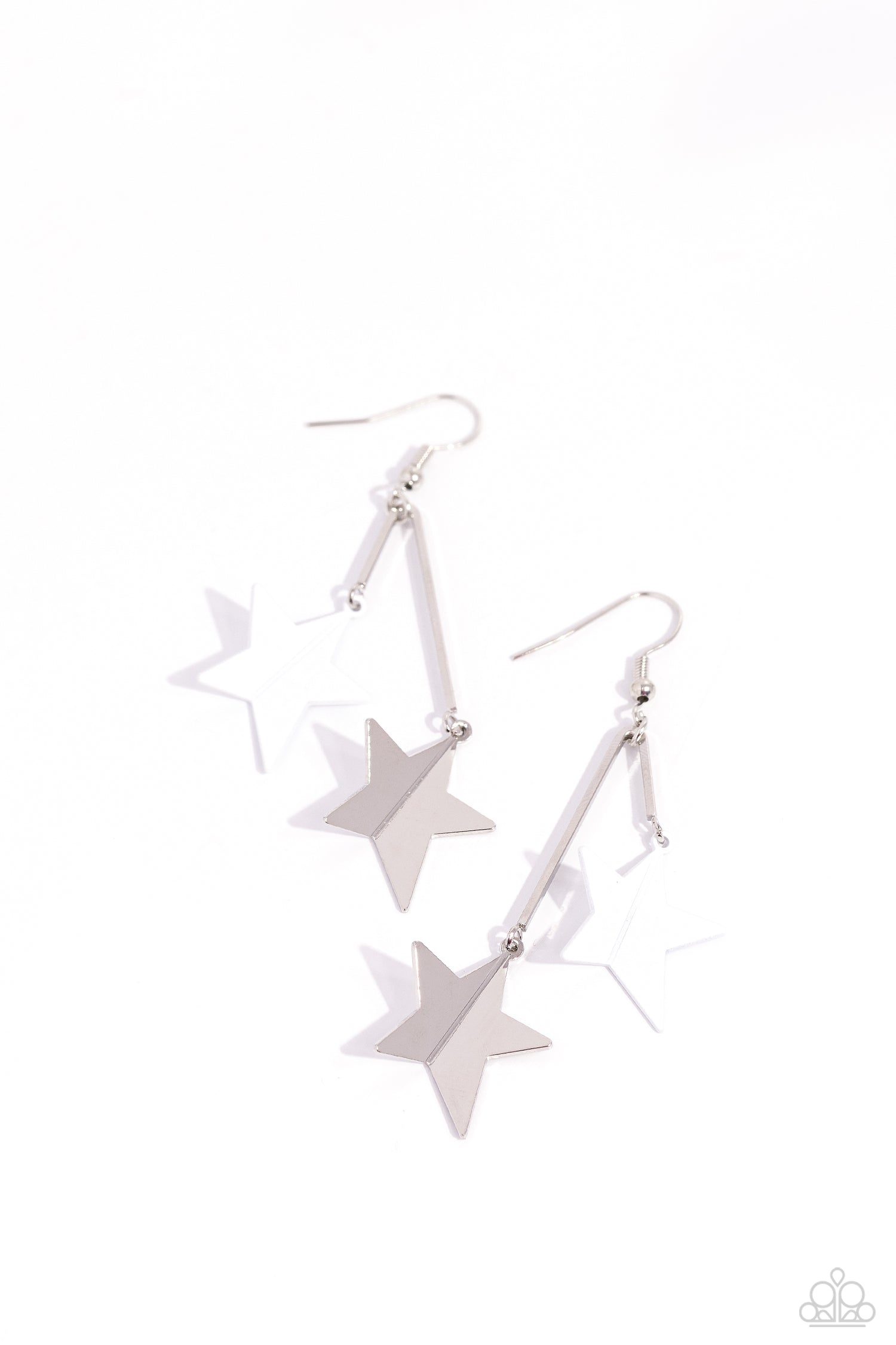 Dangling from a staggered, v-shaped silver bar, a curved white-painted and metallic silver star cascade down the ear for a starstruck fashion. Earring attaches to a standard fishhook fitting.