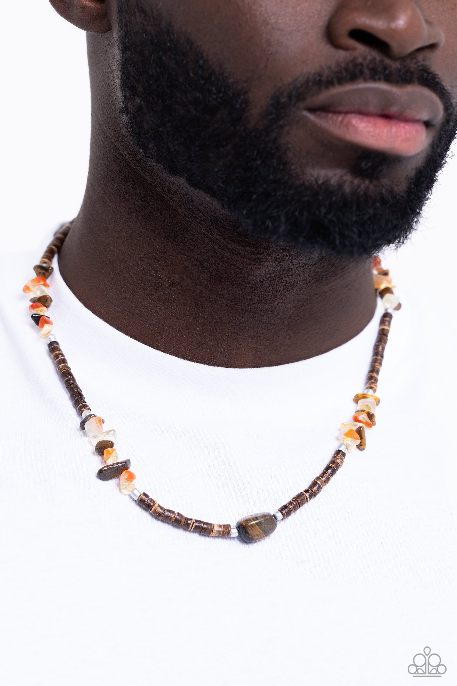 Threaded along an invisible wire, brown wooden beads, a chiseled collection of Tiger's eye, orange, white, and clear yellow natural stones, and silver fittings haphazardly coalesce down the neckline to meet an oversized, geometric Tiger's eye stone at its center for an earthy finish. Features an adjustable clasp closure. As the stone elements in this piece are natural, some color variation is normal.