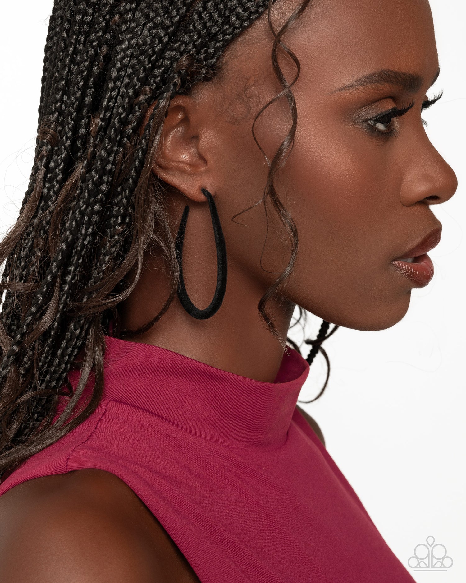 Encased in a playful felt, black teardrop hoops loop and curl below the ear for an endearing, equal display. Earring attaches to a standard post fitting. Hoop measures approximately 1 3/4" in diameter.
