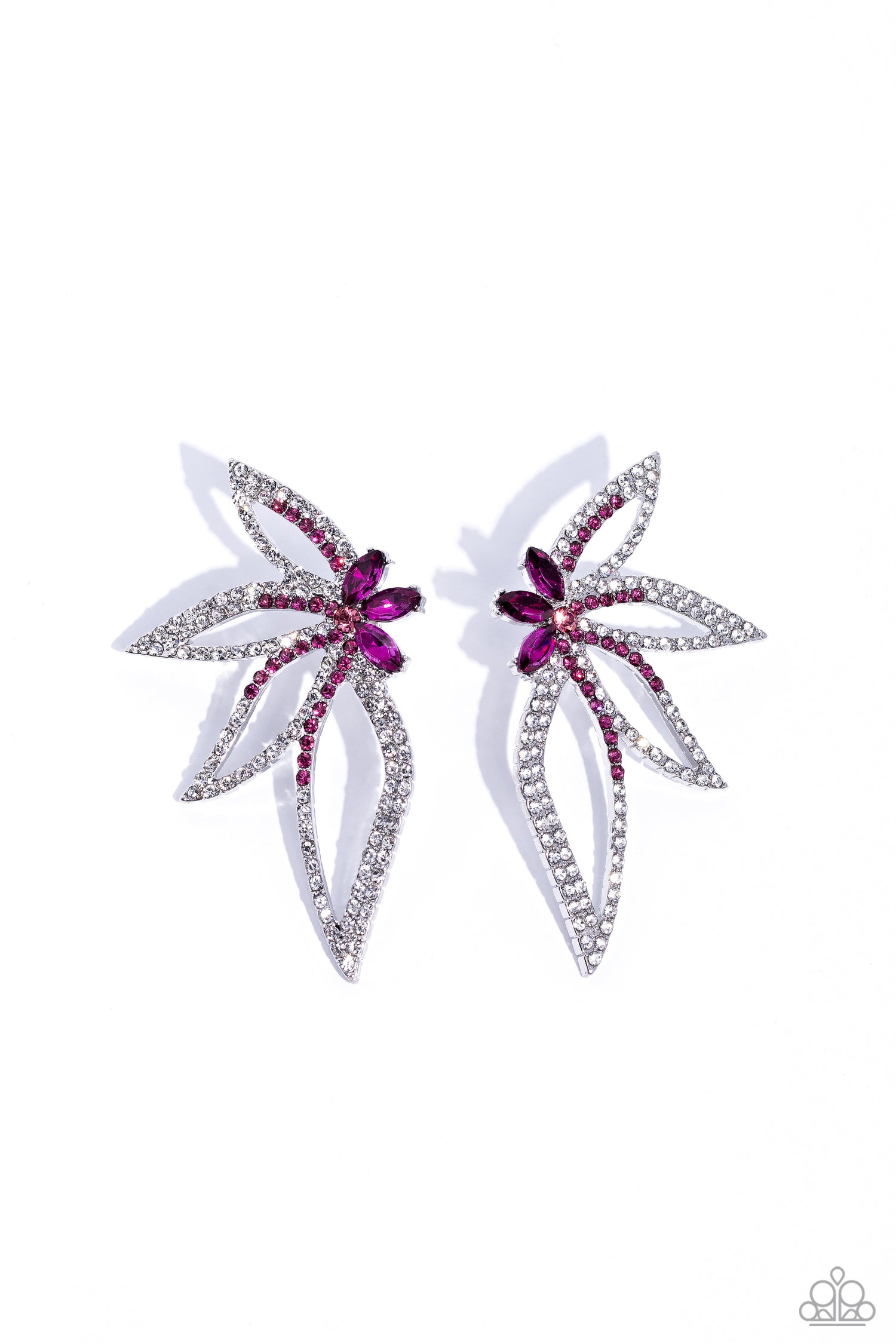 Infused with fuchsia rhinestones, white rhinestone-encrusted airy silver petals flare out in a radiantly extravagant floral centerpiece. Marquise-cut fuchsia gems cluster around a rose rhinestone for an additional pop of color. Earring attaches to a standard post fitting.